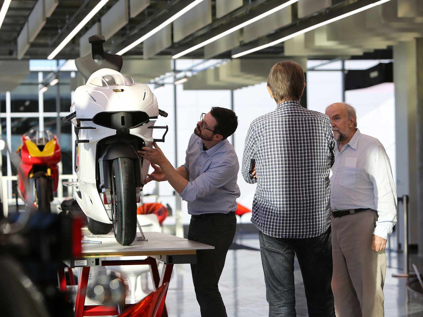 Um seine Ideen zu evaluieren, hat er einen nicht fahrbereiten, aber maßstabsgetreuen Prototyp gebaut, eine New Supermono, wenn man so will, deren Teile aus dem großen HP 3D-Drucker des Barber Design Centers stammen, größtenteils aus einem Nylonmaterial. Die Arbeit mit CAD ist zwar schnell, aber nichts regt den Verstand so sehr an wie ein maßstabsgetreues 3D-Objekt - der Grund, warum bei der traditionellen Stylingentwicklung Ton und Holz verwendet wurden. Der 3D-Drucker sorgt für mehr Genauigkeit, Geschwindigkeit und die Möglichkeit, die Entwürfe digital zu speichern.